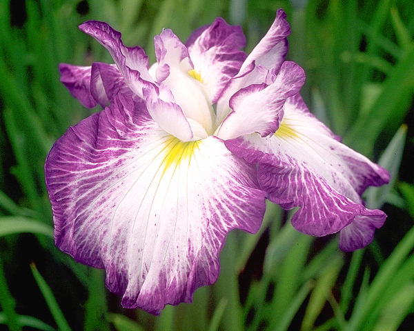 山路錦 やまじにしき YAMAJI NISHIKI 肥後系 中早 紅紫に底白の三英花。花径はおよそ15cm程度の中輪。 草丈は70cm前後。性質は丈夫、繁殖は良い。 加茂花菖蒲園にて1963〜78年頃に作出された品種。以前は当園の花菖蒲園にも 多く植栽され、大量に出荷されていたので、全国の園で普及していると思われる。 肥後系としては、やや物足りない感じを受ける。
