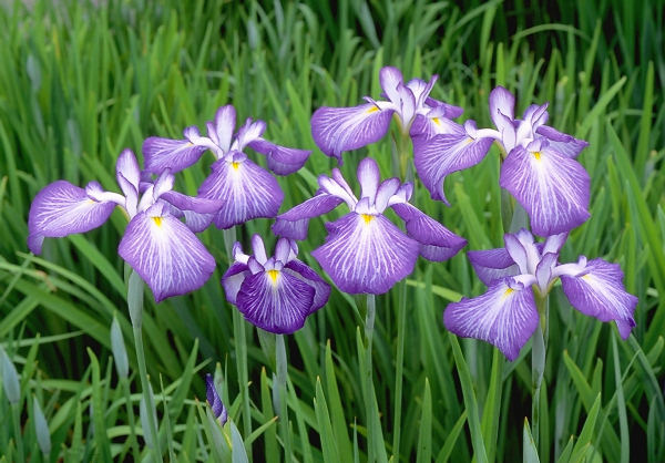 山野辺 やまのべ YAMANOBE 長井系 薄紫に白筋が入る三英花。花径は約10cm程度の小輪。 草丈は100cm程度。性質、繁殖は普通。 長井古種系の実生より加茂花菖蒲園が1985年に作出した品種。端正な花形と小輪ながらすっきりと した明るく爽やかな色彩を持つ小輪の良花である。