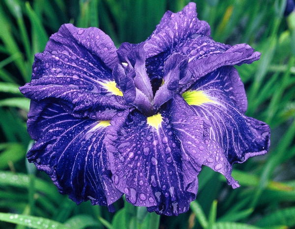 肥後系 紺紫に白筋が控えめに入る六英咲き。花径はおよそ18cm程度の大輪。