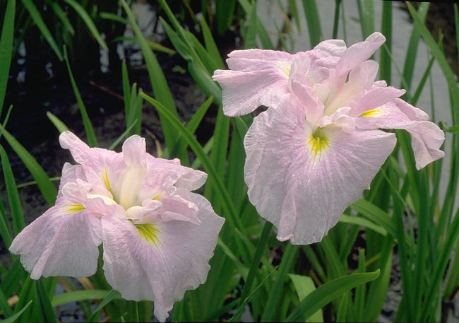 夜 桜 よざくら YOZAKURA 肥後系 中生 薄いピンクで底が白くぼかす三英花。花径はおよそ15cmを越す大輪。 草丈は低く50cm程度。性質は普通、繁殖はやや少ない。 「品種総目録」には、1975年牧野善作氏の作となっているが、平尾先生が牧野氏に花を持たせた もの。この画像の花はよく咲いているが、色彩が淡く、花形のまとまりがやや悪いように感じている。 ピンク系はこんにちでは多くの美しい花が出来たので、この品種も過去のものになった感がある。