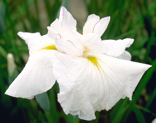 夕 鶴 ゆうづる YHOZURU 江戸系 中生 白に鉾の縁のみ紅の細覆輪がかかる三英花。花径はおよそ15cm程度の中輪。 草丈は100cm前後。性質、繁殖は普通。 加茂花菖蒲園の加茂元照る氏が、1979年頃に作出した品種。同じ江戸系の「武蔵川」が青覆輪なのに 対し、こちらは紅の覆輪が入る。