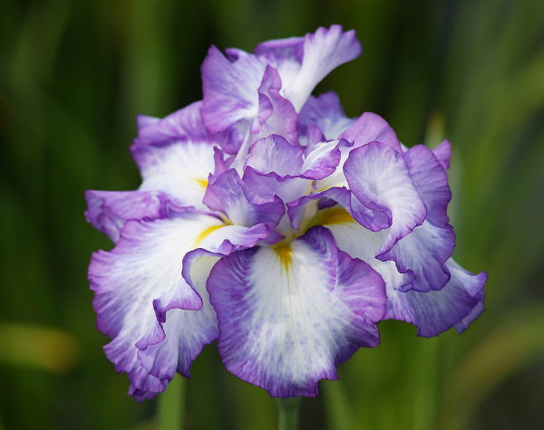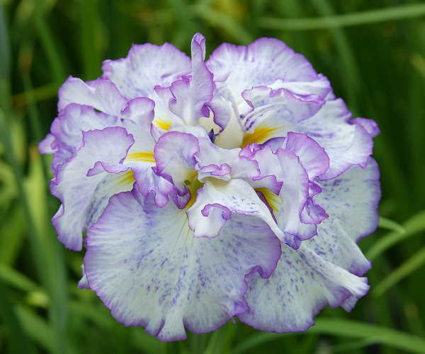 夢の羽衣 ゆめのはごろも YUME NO HAGOROMO 江戸系 中生 白地に青紫の覆輪と斑点が入る八重咲き。花径は20cmを越す大輪。 草丈も100cm程度には伸び、性質も丈夫で繁殖も良好という、これだけ豪華な花には珍し い性質の良い品種である。将来多くの花菖蒲園で植えられるようになるかもしれない。 1997年 加茂花菖蒲園の作。 上の画像は温室で咲かせたもの。下の画像は咲き始めで、青覆輪の広く出た花。