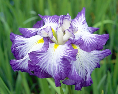 蛍の精 ほたるのせい HOTARU NO SEI 肥後系 晩生 白地に紺色の覆輪ぼかしの六英。花の直径は15cm程度の中輪。 白地に紺覆輪の系統では、本種が一番鮮明で覆輪も幅広く美しい。性質が弱いのが欠点。 1968年 光田義男作